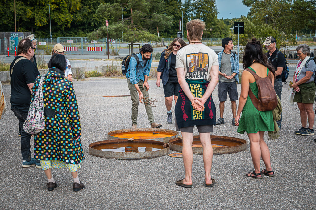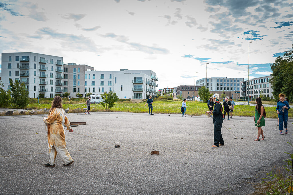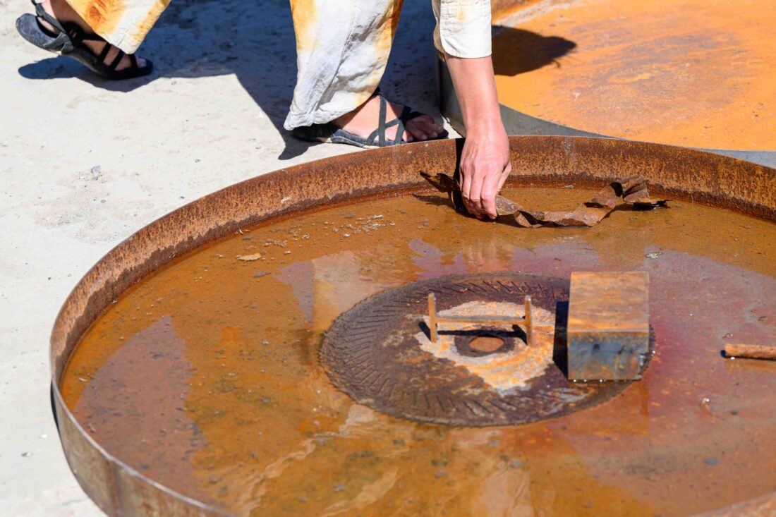 Her efterlader vi ikke bare det rustne jern. Vi tager det op, rører ved det, undersøger det. Vi mærker dets vægt, hører dets lyd, ser dets skiftende farver. Sammen udforsker vi rust som noget, der forbinder industri, natur og krop – som en del af det landskab, vi lever i, og de strukturer, vi skaber.